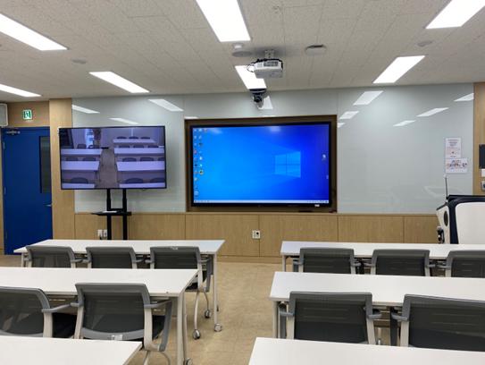 스마트 강의실 스마트 강의실은 온·오프라인 병행 강의가 가능한 강의실로 대면, 비대면으로 동시 진행되는 하브리드수업환경에 적합한 강의실이며, 수업자동녹화 시스템이 마련되어 있어 교수자가 스스로 KOCW, K-MOOC 강의공개 프로그램 녹화가 가능함 강의실 구축 현황 강의실명, 구축건물, 호실 강의실명 구축건물 호실 스마트 강의실 (2020) 문화스포츠관 315호 강의실 전경
